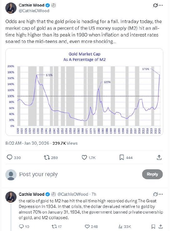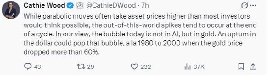 方舟投资管理公司创始人凯茜·伍德周四在社交平台X上发布一连串帖子,对黄金的泡沫风险发出警告。