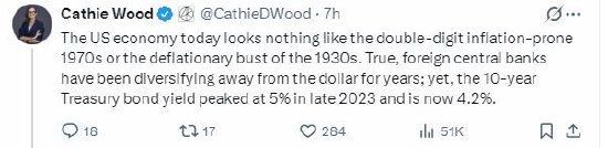 伍德接着写道:“今天的美国经济与上世纪70年代两位数通胀高企的时期,或是上世纪30年代通缩萧条的时期截然不同。诚然,外国央行多年来一直在减少对美元的依赖;然而,10年期美国国债收益率在2023年末达到5%的峰值,而现在已降至4.2%。”
