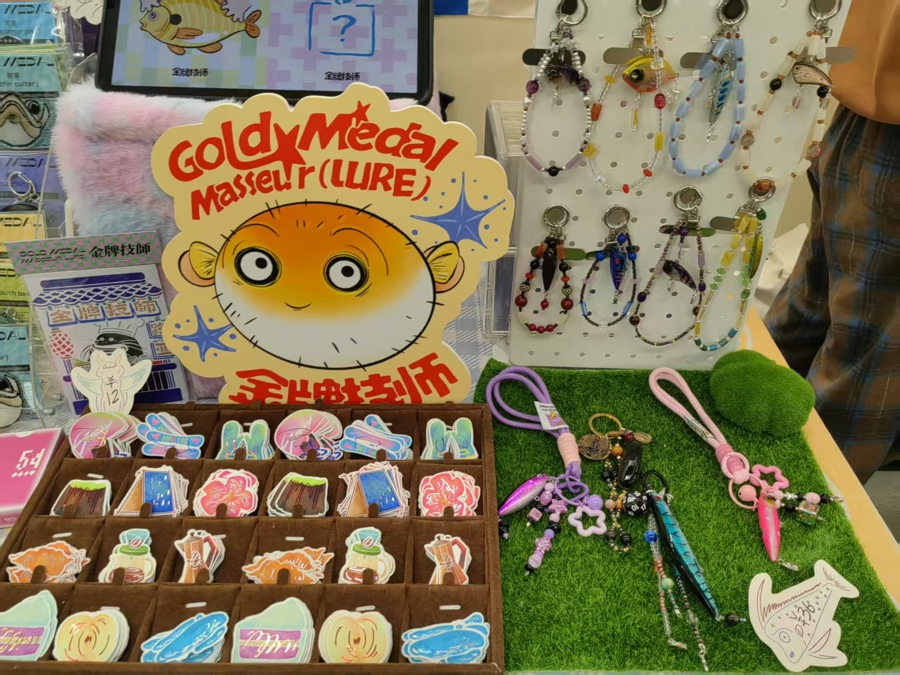 在市集上,有香薰、首饰、服装、包袋、毛线编织等常见品类,也有一些一眼望上去让东说念主猜不到在卖什么的特质摊位。金牌技师(路亚)控制东说念主姚东妮的摊子上摆着卡通鱼图案的钥匙扣、贴纸等,这是资深“垂钓佬”途经时会心一笑的兴趣兴趣相近。“垂钓有手竿和路亚两种钓法,前者钓食草类的鱼,后者针对食肉类、有袭击性的鱼。”姚东妮指着摊位上的一串串手工钥匙链向记者科普,上头挂着的塑料小鱼是她玩路亚时用到的假饵。钓“翘嘴”鱼时要保握水面爽朗,钓鲈鱼时则要尽可能作念出波动来诱骗袭击,像是推拿手法,这是她为我方的原创品牌取名“金牌技师”的原因。