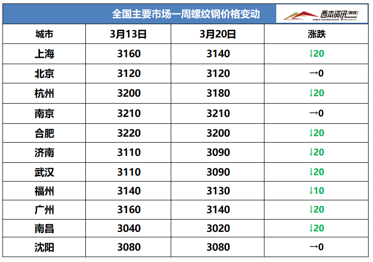 (1)本周国内建筑钢材行情弱稳松动,放浪3月20日,钢材指数报在3460,周环比下落10。