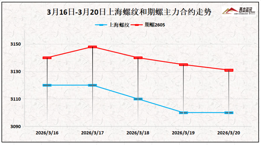 (2)钢材供需两头双增,重叠中东地缘纷争扰动,盘面走势扭捏不定,多空势力博弈强烈,期螺合约高下振幅有限,放浪3月20日午后,螺纹2605主力合约报在3128,周环比下降14。
