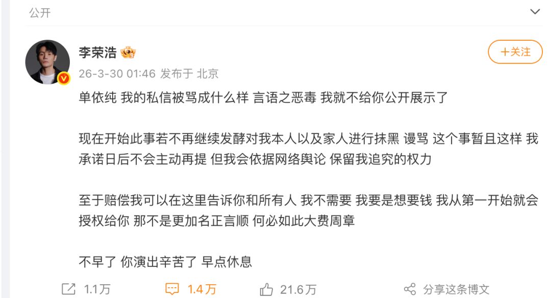 3月29日,李荣浩公开指控单依纯在深圳演唱会未经授权翻唱《李白》,此事不断发酵。