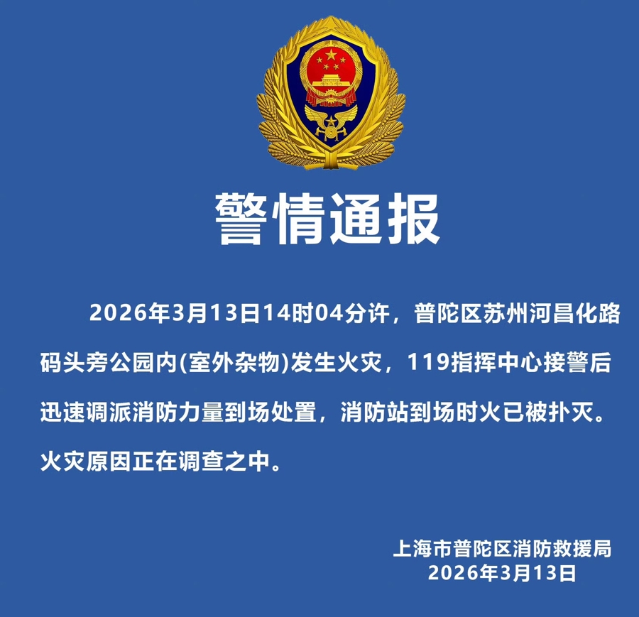 据普陀区消防支队发布的警情通报:2026年3月13日14时04分许,普陀区苏州河昌化路船埠旁公园内(室外杂物)发生失火,119教唆中心接警后赶紧调派消防力量到场处理,消防站到场时火已被扑灭。失火原因正在探望之中。