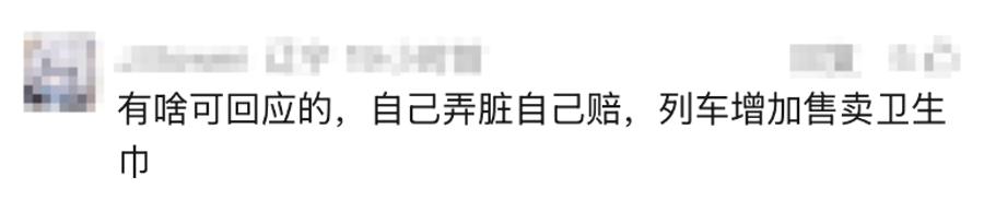 张女士承认我方有包袱,也招供损坏财物需抵偿,但她建议疑问:“列车上会配售滚水、零食和卫生纸,而卫生巾相似是女乘客的刚需,为什么莫得售卖?”