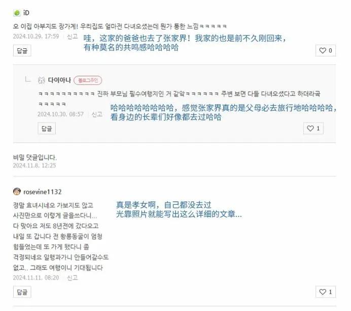 有韩国网友共享万字攻略,称父亲游览后欣慰地发一又友圈夸耀,挑剔区则赞誉其为“孝女”,并惊奇“张家界是父母必去之地,身边父老似乎王人去过了”。
